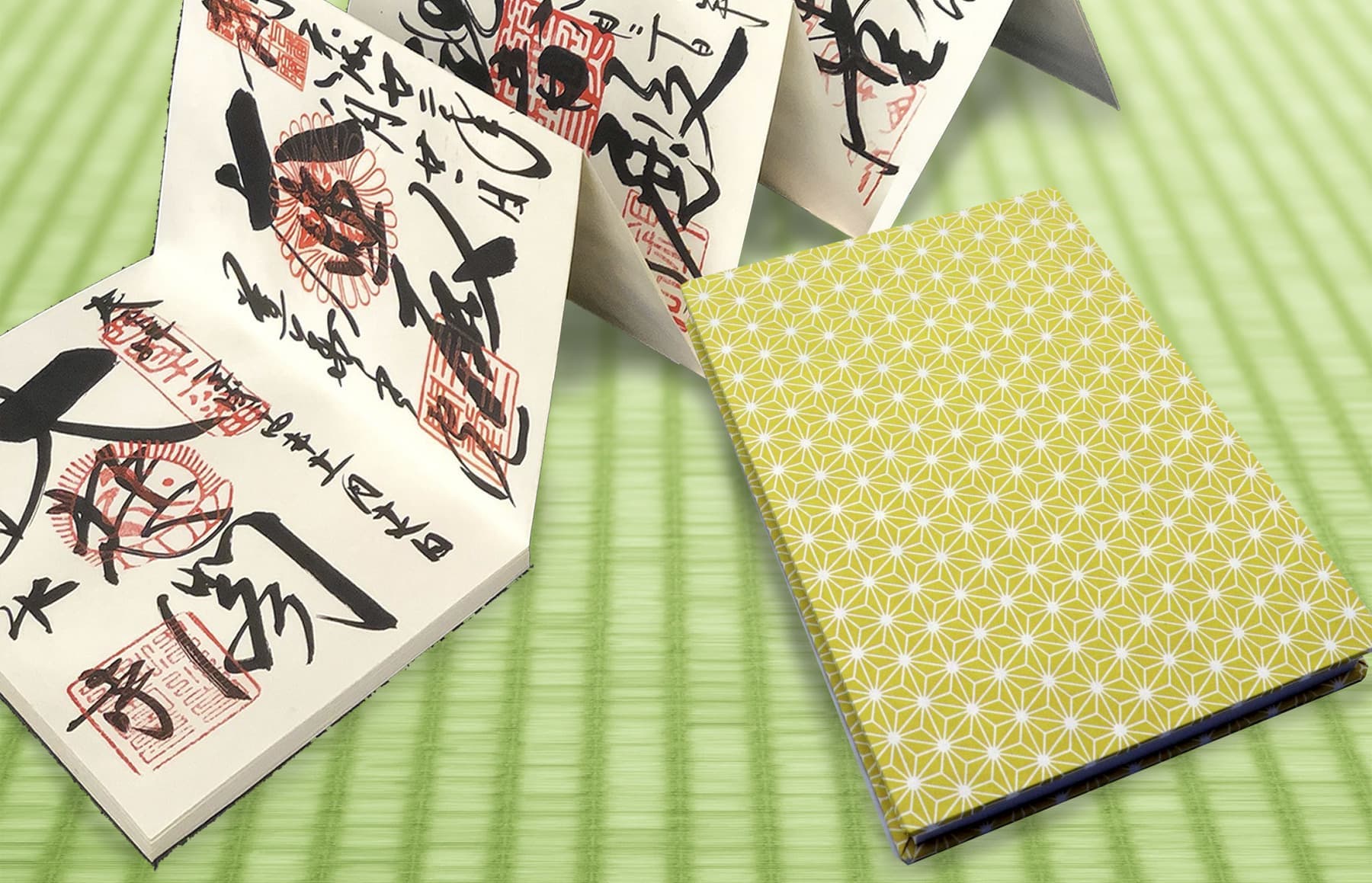 表紙はからし色の麻の葉柄の和紙で製本しています。